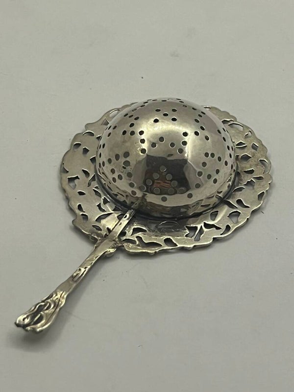Heel mooi zilveren theezeef met een sierlijk opengewerkte rand.