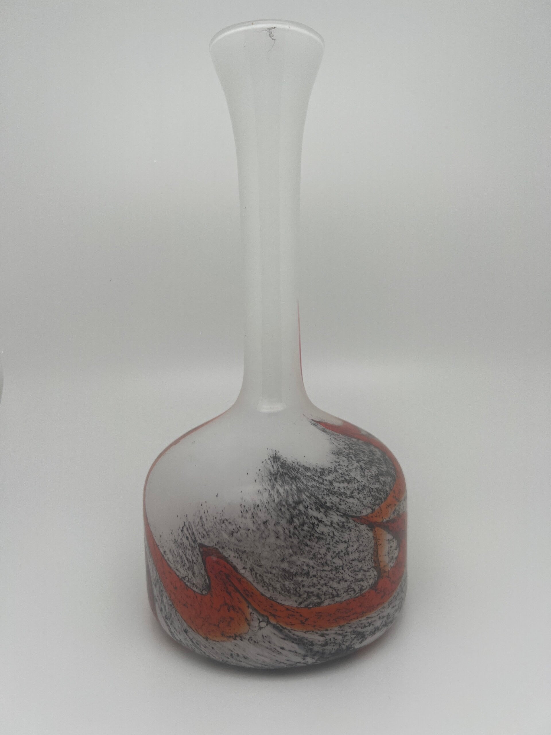 Decoratieve handgeblazen vaas met opaline witte hals en ingekapseld rood-zwart patroon in het corpus. Moderne studioglasproductie, Europees. Uniek vrijgeblazen exemplaar met karakteristieke kleurovergangen. In goede staat.