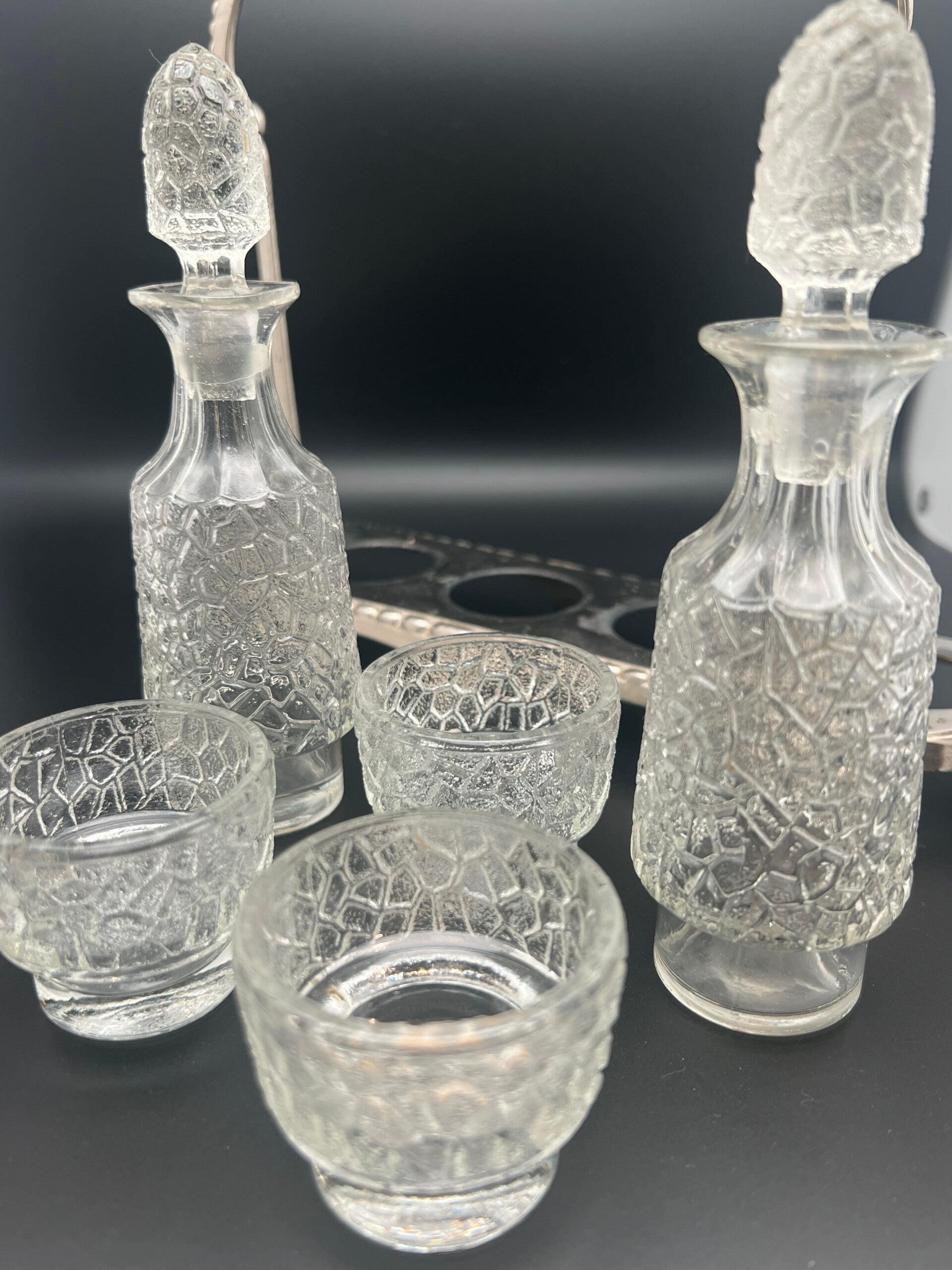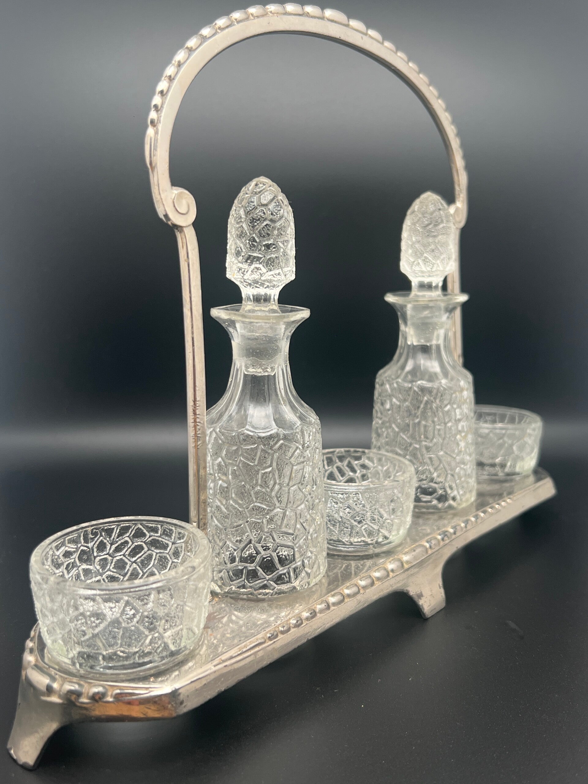 Victoriaans olie- en azijnstel met vernikkelde houder en origineel geperst glas (geen kristal). Het rek bevat twee karaffen met stop en twee kleine bakjes voor kruiden of saus. Eind 19e eeuw, decoratief en functioneel tafelstuk. In goede gebruikte staat met lichte ouderdomssporen passend bij de leeftijd.
